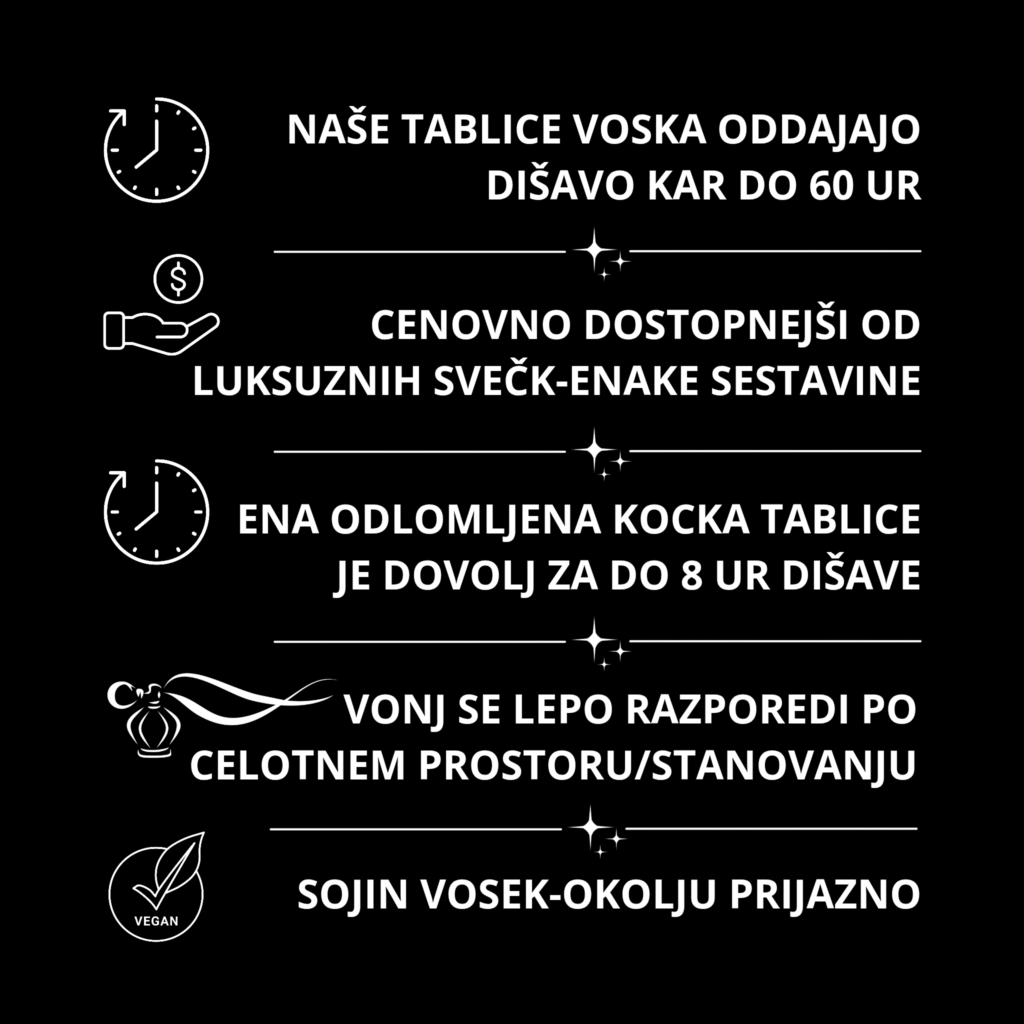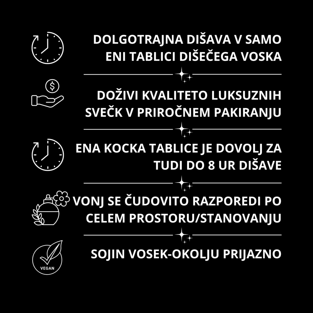 Naši dišeči voski so ročno izdelani, veganski, narejeni iz sojinega voska, obarvani z naravnimi pigmenti (micami), ki se uporabljajo tudi v kozmetiki, ter odišavljeni s preverjenimi in odobrenimi dišavami s strani združenja za dišave (IFRA kodeks).